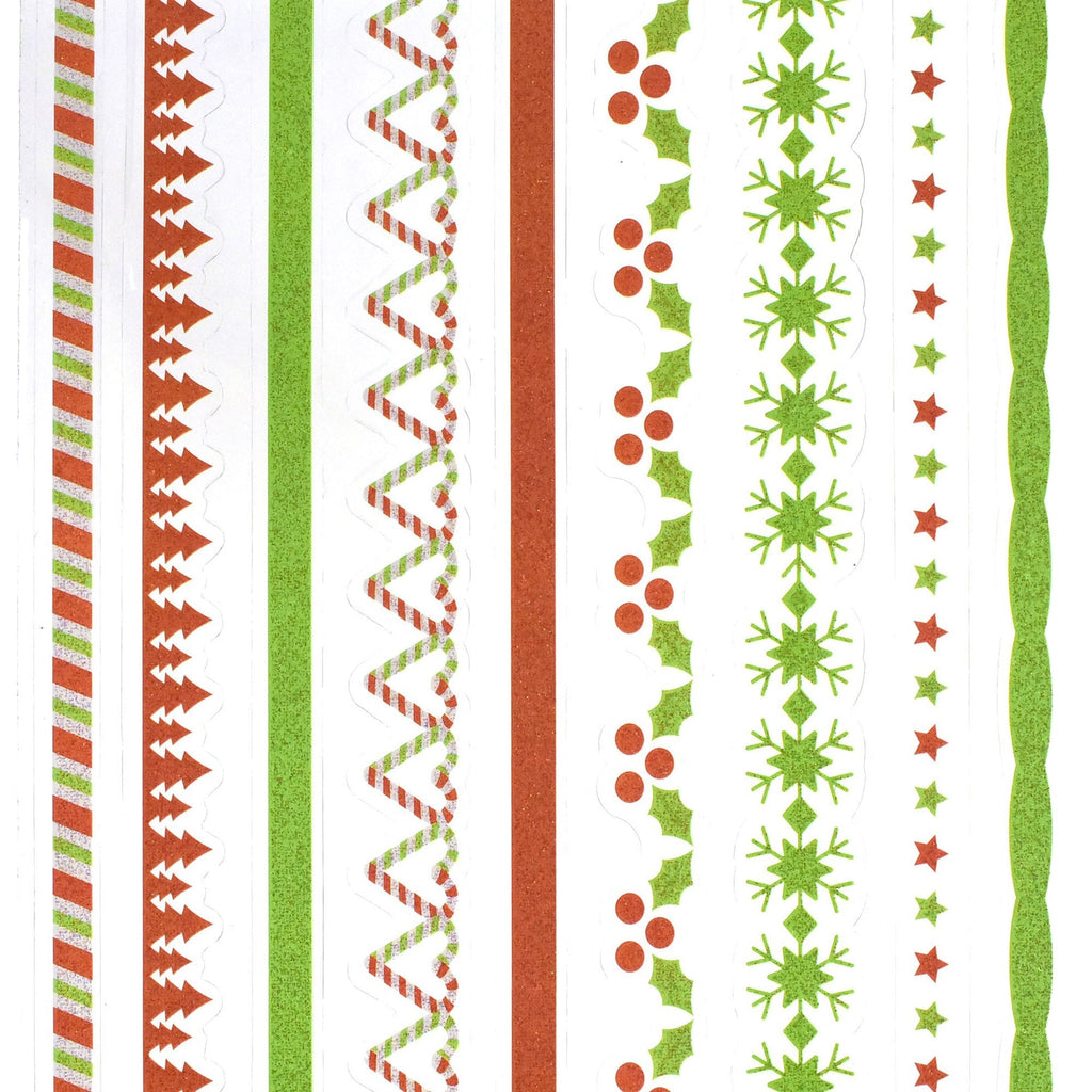Add a festive touch to your Christmas projects and decorations with these adorable holiday stickers! The stickers feature long strips of classic Christmas themed broder lines including glittered stripes, candy canes, snowflakes, and holly berries. Perfect for any holiday DIY craft project! Pack: 9 stickers Sticker Length: 11.5"