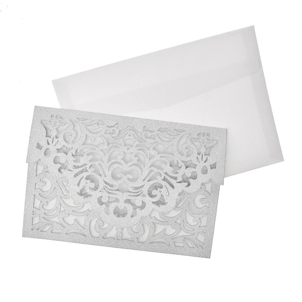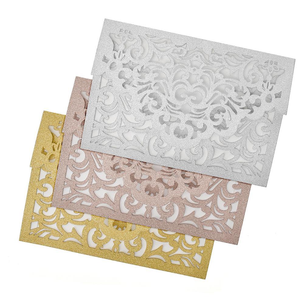 Announce your next special event with these beautiful and elegant invitations. This glitter texture and precise laser cut features make these invitations a great way to commemorate those major events in your life. Perfect for weddings and anniversaries! Invitations are sold in a set. Includes 1 invitation, 1 paper insert, and 1 envelope.
