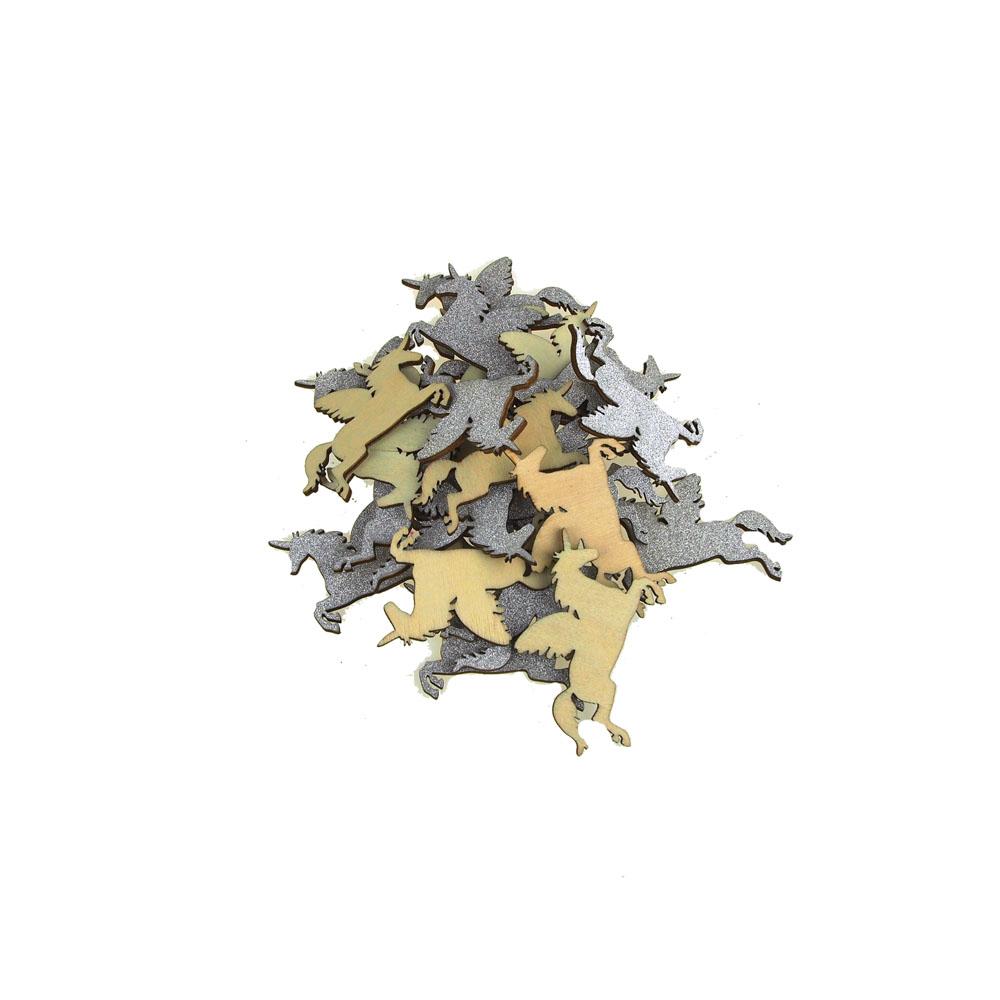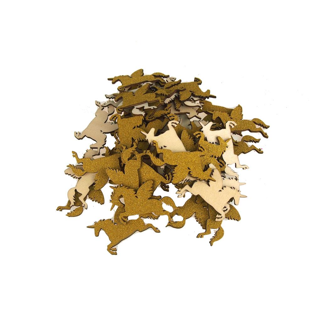 Available in packages of 10, 25, 50, and 100 unicorn glitter wood favors.