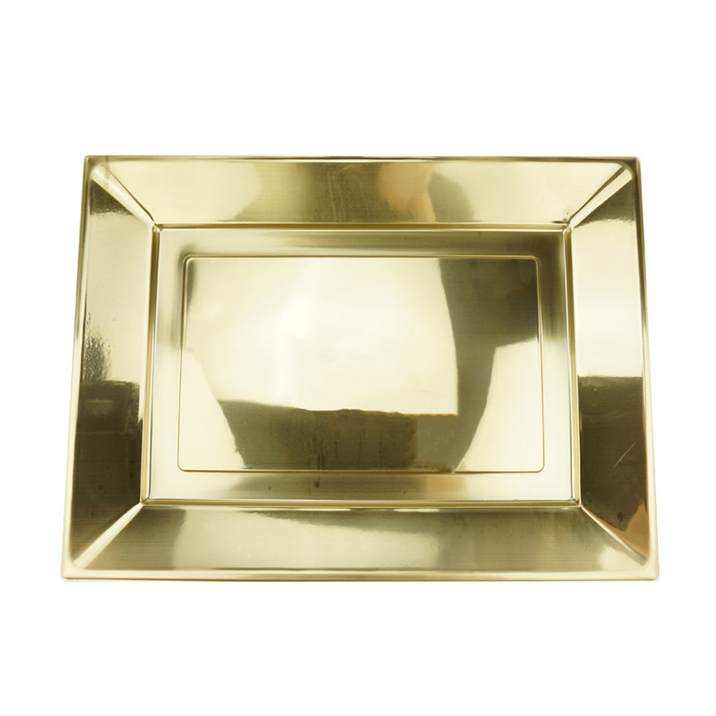 Create an amazing display of snacks and treats with these rectangular party serving trays! These trays are perfect for family get togethers, sports watch parties, and other events. Fill the trays with different varieties of snacks like chips, pretzels, dried fruits and more. Features two plastic trays in a white or metallic gold or silver color. Each pack comes with two identical serving trays. Length: 15" Width: 11"