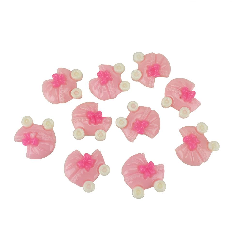 Features a baby carriage in blue or pink color. Each order comes with 10 of the baby carriages in a blue or pink color. Note: Table scatter is one-sided. Measurements are for individual table scatter.