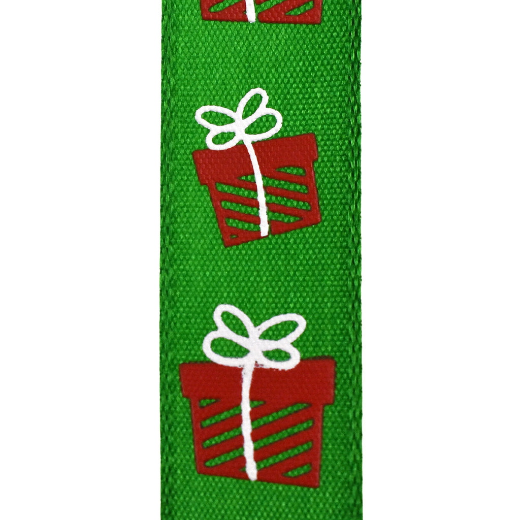 This satin ribbon is perfect for decorating packages and gift boxes. Sporting a pattern of adorable present boxes, this is the perfect accessory to any holiday craft! You can also use it to embellish cards or scrapbook items, making them look like they came from a fancy department store or designer boutique! Note: Does not contain wire Length: 10 yd Width: 0.625"