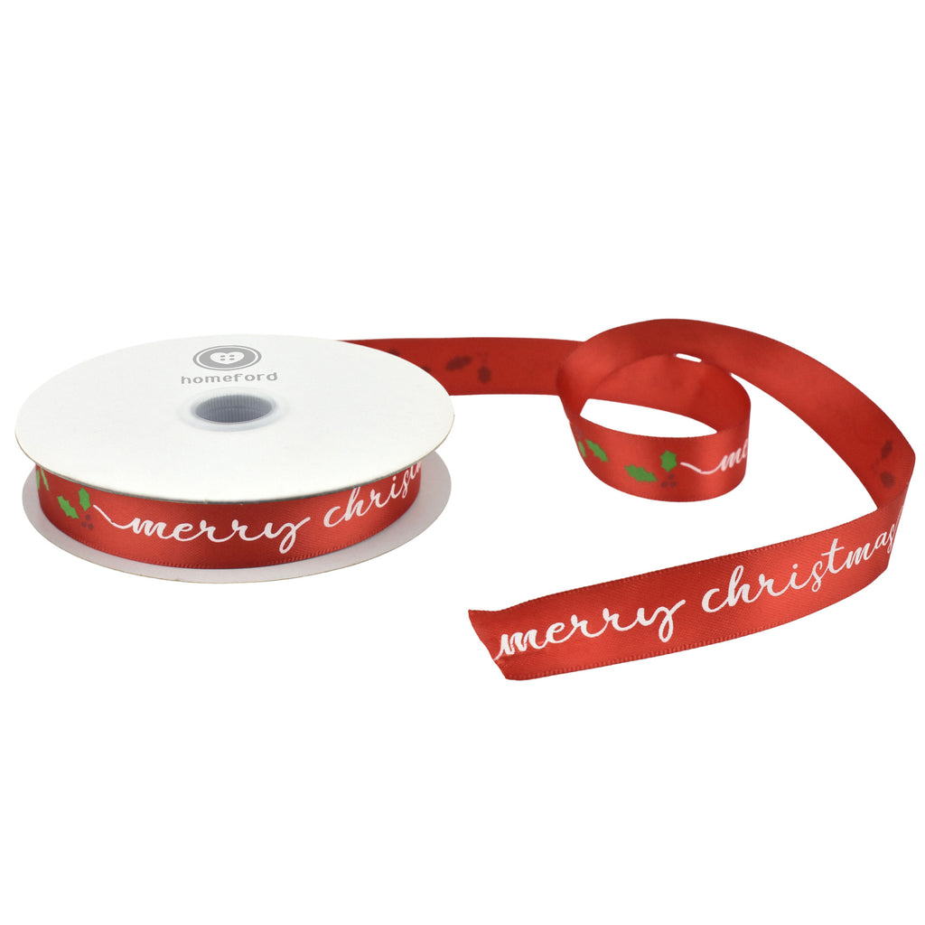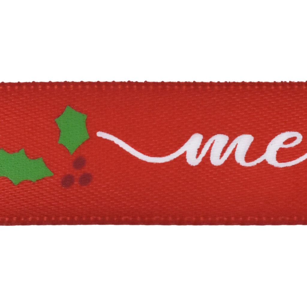 Merry Christmas Cursive Script Holly Berries Satin Ribbon, 5/8-inch, 10-yard