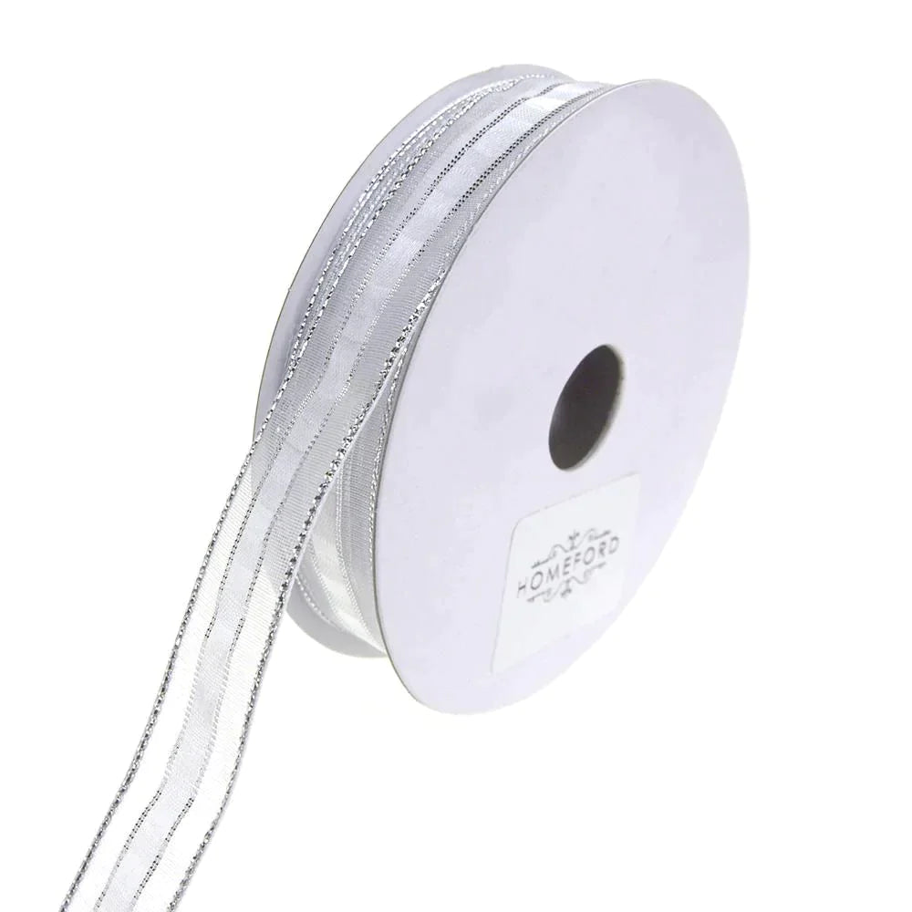 This beautiful sheer ribbon with woven center is accented with either iridescent or metallic trim, almost reminiscent to corsage ribbon. This ribbon is extremely versatile, and can be used as an accent to large pom pom bows, used by itself for smaller bows, and used in wedding, Christmas, or other party decorations!