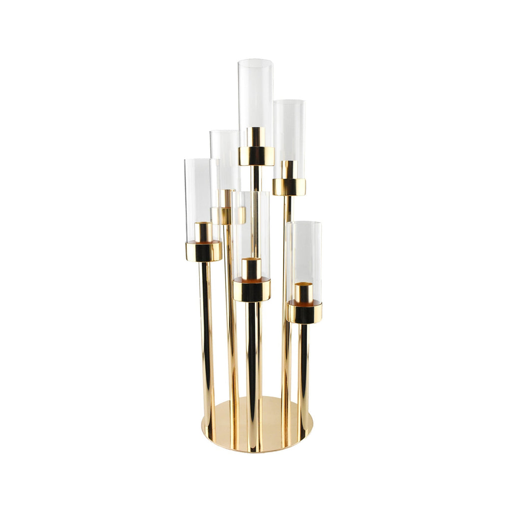 Add the perfect accent to your party's decor with this stylish centerpiece! Featuring 6 cylinders, you can place tapered candles, or decorate around it with flowers or garlands. Perfect for making a statement at parties, home decor, or any event!