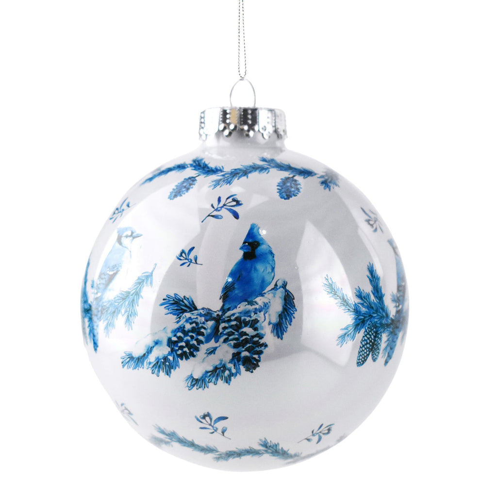 Decorate your Christmas tree or mantelpiece with these festive glass ball ornaments that feature bluebirds and branches. Their lovely, porcelain-style pattern will fit perfectly in any setting and complete a elegant and beautiful aesthetic. Perfect for holiday and special occasions, these versatile glass baubles are the perfect addition to your home decor! Pack: 2 pcs Ornament Diameter: 3.5"