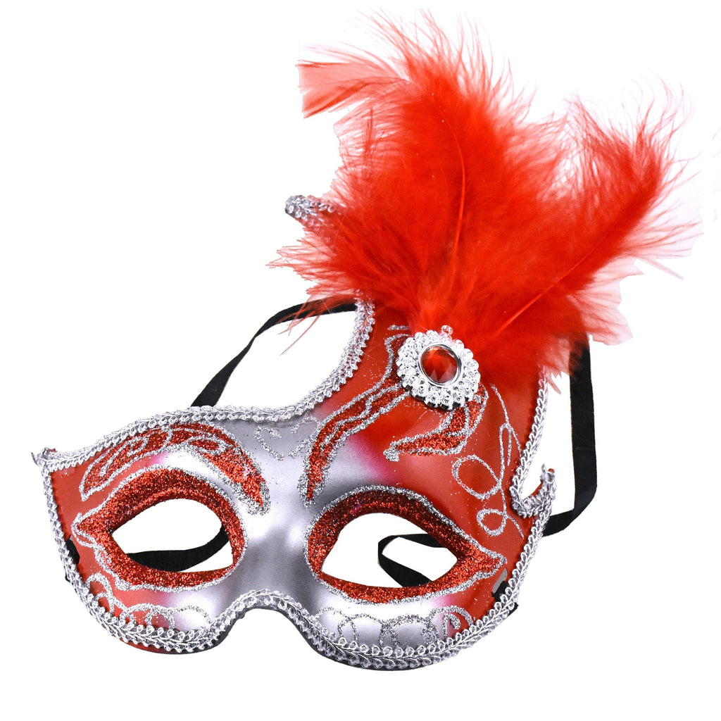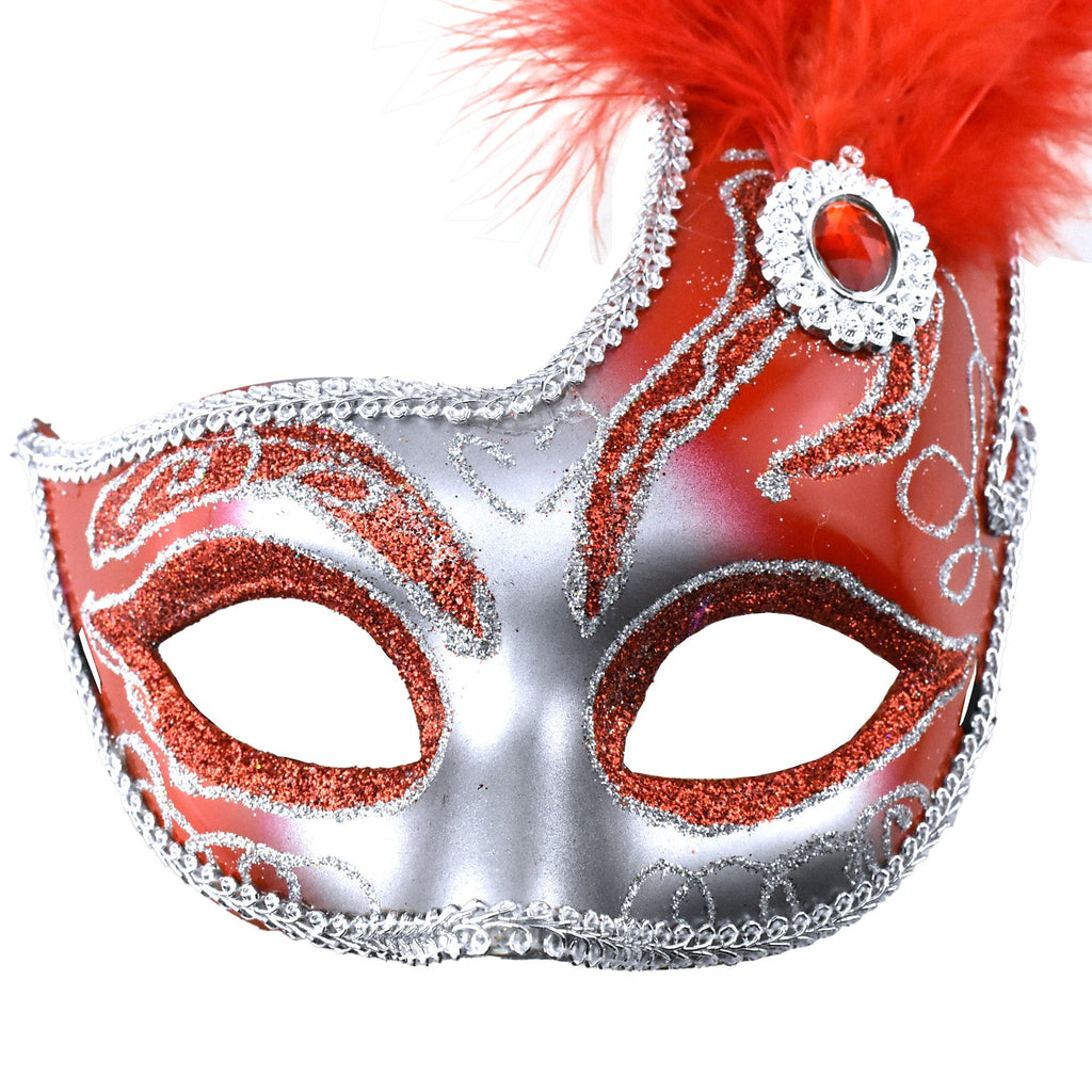 Fancy Feather and Gemstone Accent Mask, 10-1/4-Inch x 6-3/4-Inch - Red