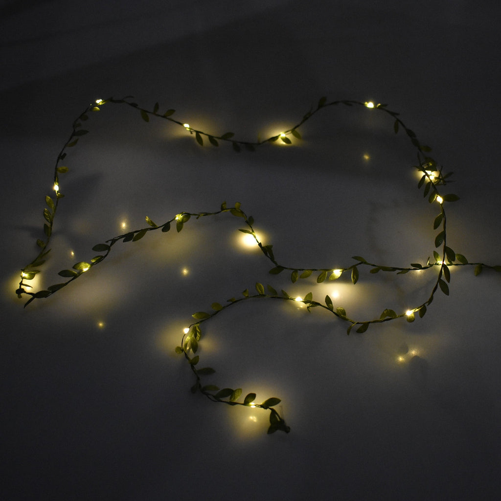 Light up any space with these LED string lights! Featuring aesthetically pleasing vine leaves, these string lights can be placed on walls and other surfaces and put on a show simply by plugging in! Requires 3 AA batteries. String Length: 7 ft