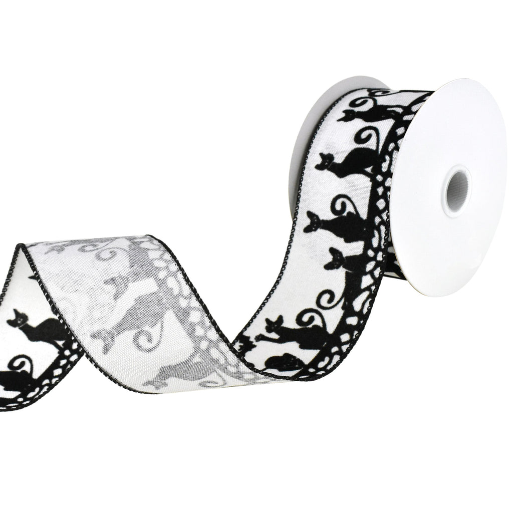 Add a fun, playful touch to whatever you're making this Halloween and beyond, with this ribbon! The black cats made of flocked velvet are adorable and will look just right on your wreath or floral arrangement. The perfect accent piece for every seasonal decorating project-from candy bowls to wreaths to floral arrangements! Note: Contains wire Length: 10 yd Width: 2.5"
