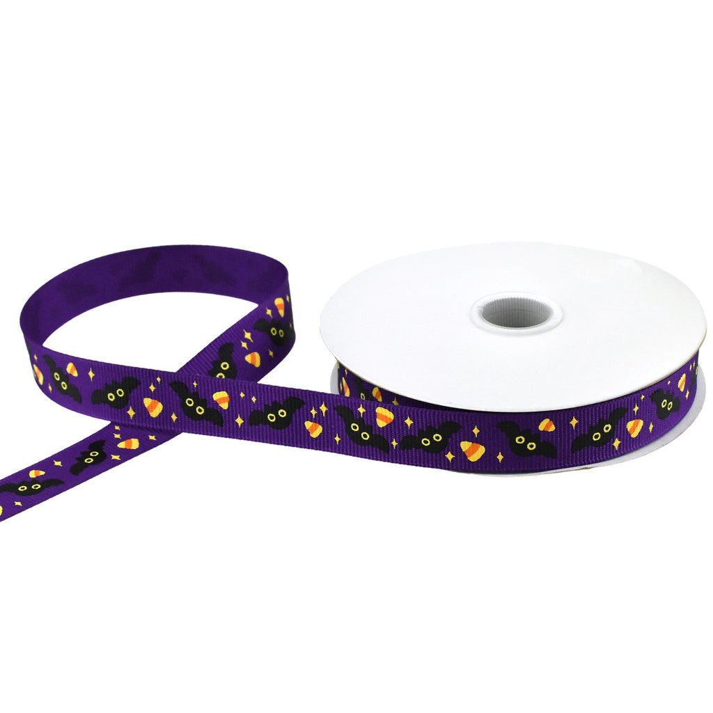 Halloween Candy Corn & Bats Grosgrain Ribbon, 5/8-Inch, 10-Yard - Purple
