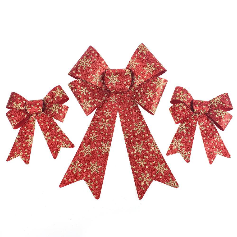 Glitter Snowflake Print Plastic Christmas Bows, Red/Gold, 6-Piece