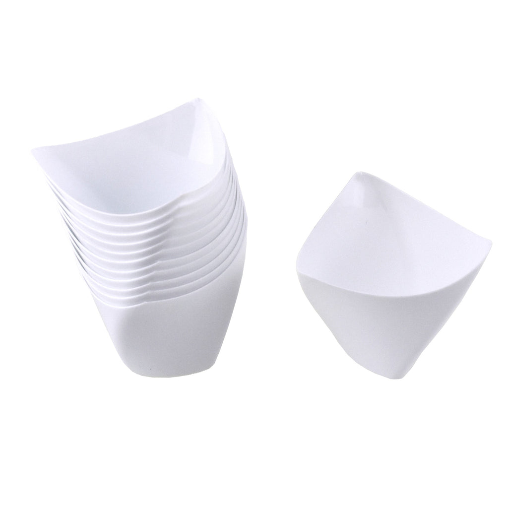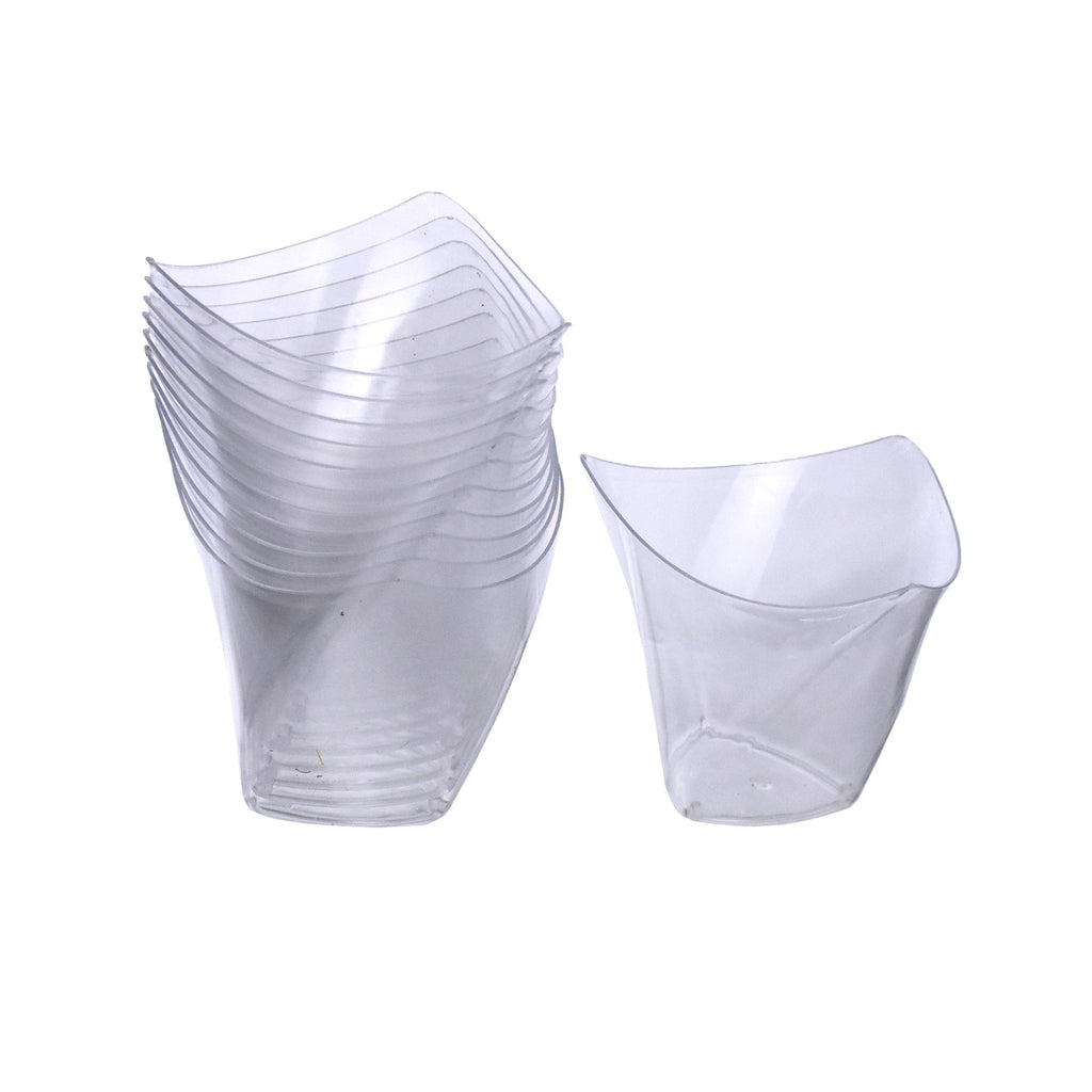 Whether you're looking to serve a decadent dessert at the end of a meal, or just want to add a layer of class to your next party spread, these plastic dessert bowls are an elegant choice. The triangle shape of the bowl makes it easy to set as a centerpiece and place your favorite treats into them. The bowl is deep enough for plenty of ice cream or gelatin. Length: 2.75" Width: 2.5" 12 Pcs