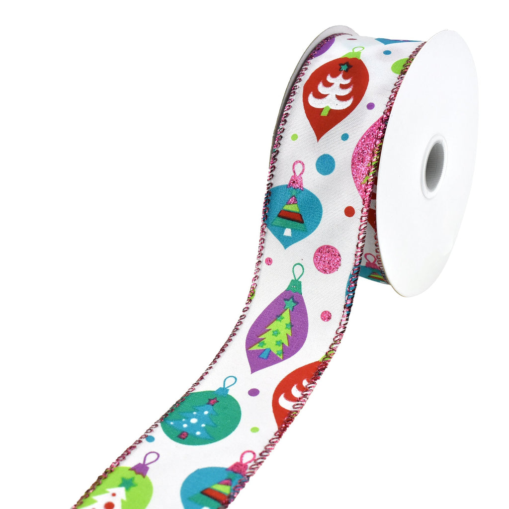 Add your own touch to any project! This ribbon features an assortment of Christmas ornaments in various shapes and sizes speckled with polka dots for the perfect finishing touch to any home decor, DIY, or craft project you use these with. Take your decorating or DIY to the next level! Note: Contains wire Length: 10 yd Width: 1.5"