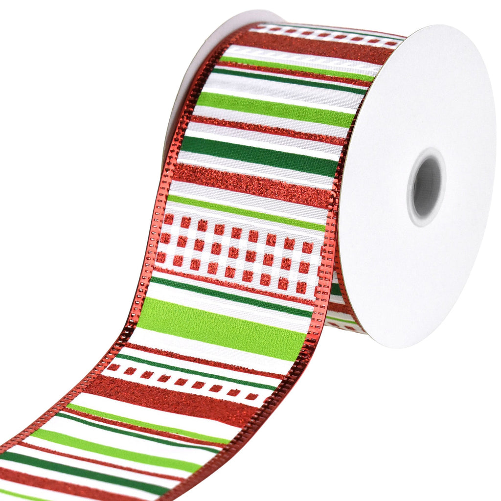 Christmas Patterned Stripes Metallic Edge Wired Ribbon, 10-yard