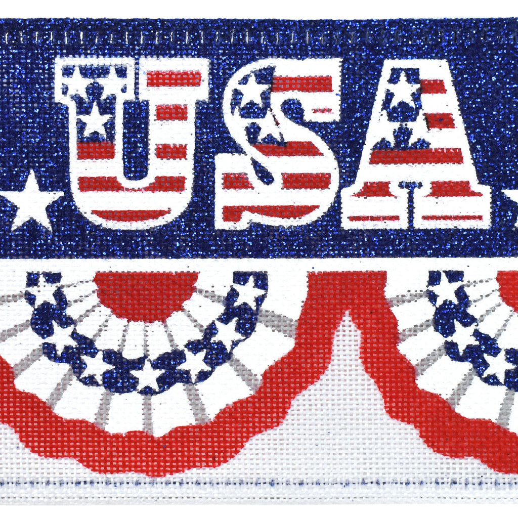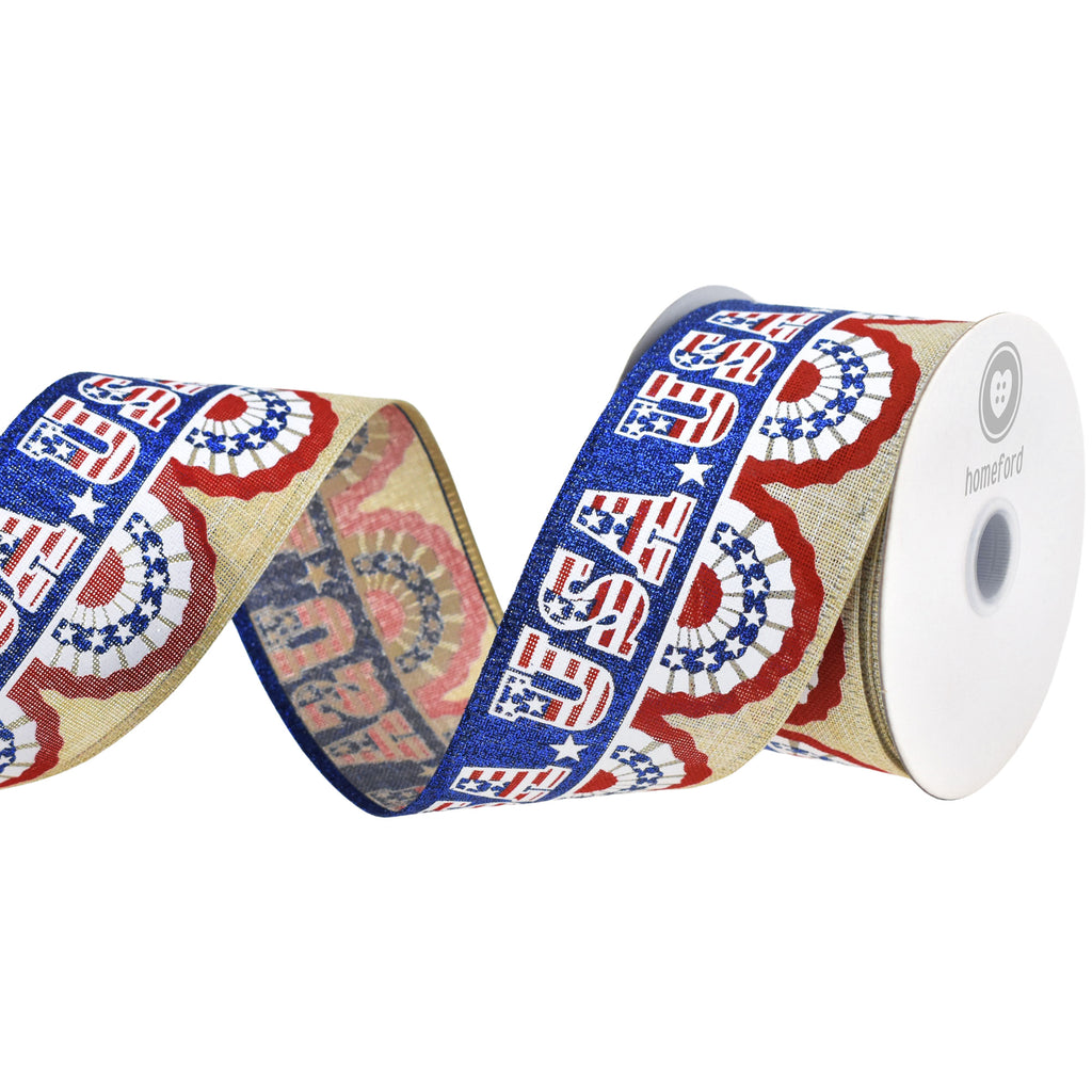Patriotic Pleated Fan Flags Faux Linen Wired Ribbon, 2-1/2-inch, 10-yard