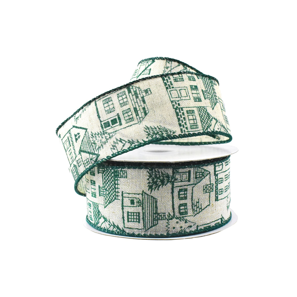 Christmas Winter Outlined Homes Wired Ribbon, 1-1/2-Inch, 10-Yard