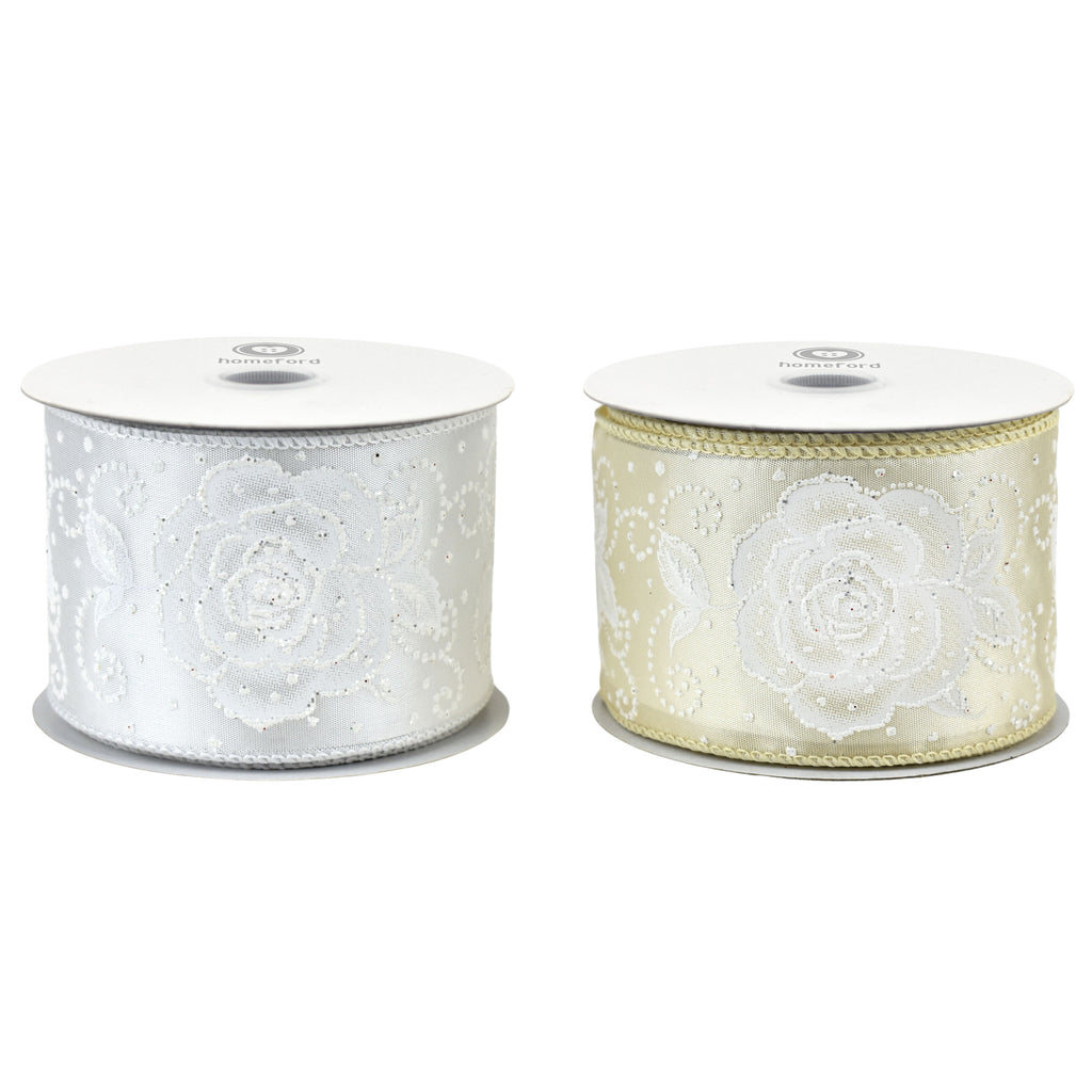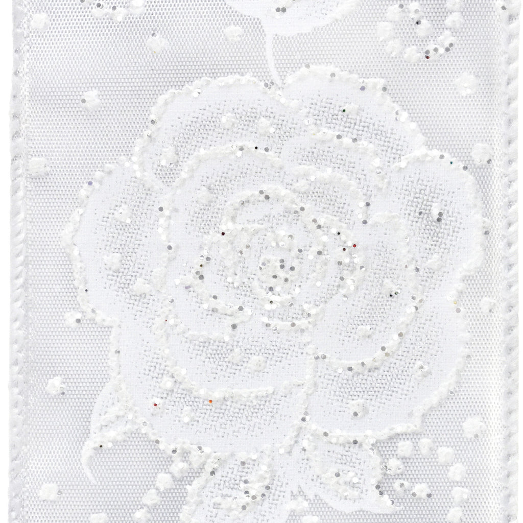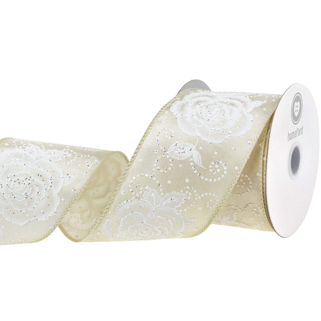 Glittered Wedding Rose Pattern Satin Wired Ribbon, 2-1/2-inch, 10-yard