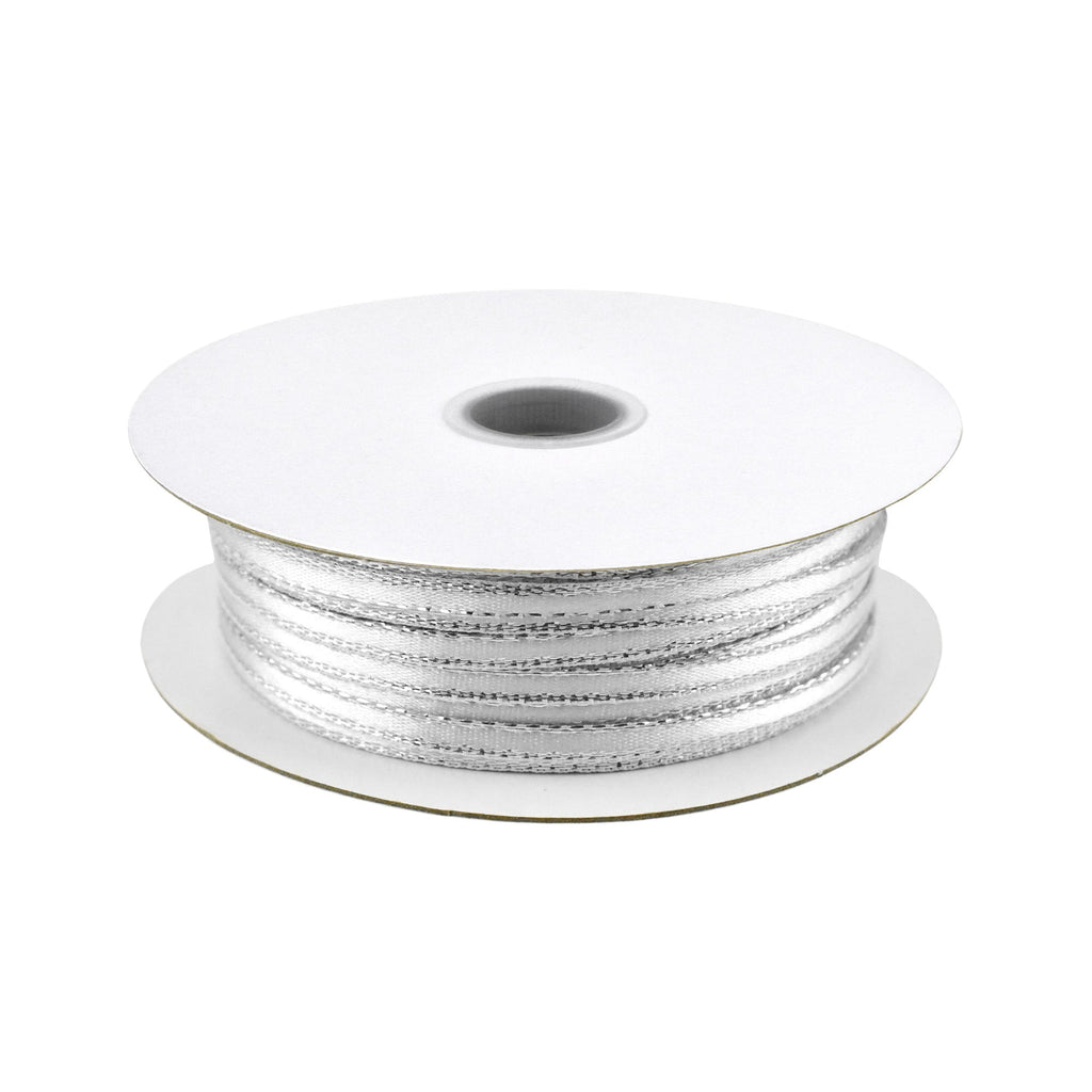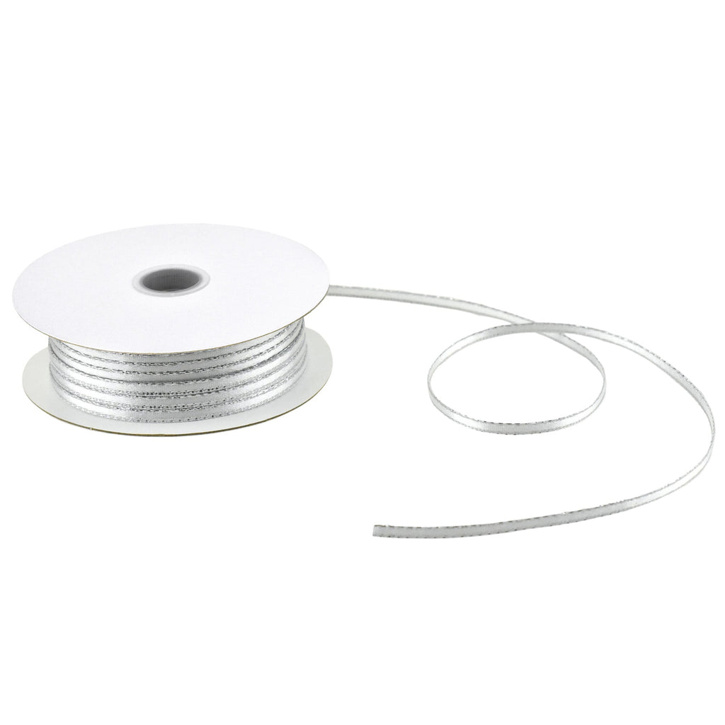 Single face satin ribbon with a sparkling silver metallic trim edge are perfect for gift wrapping and crafting. It's a great quality ribbon and ideal for birthdays, baby showers, garments, packaging, bridal and wedding use as well as arts and crafts and scrap-booking! Add the perfect finishing touch for your decorating, DIY projects, gift giving, and more!