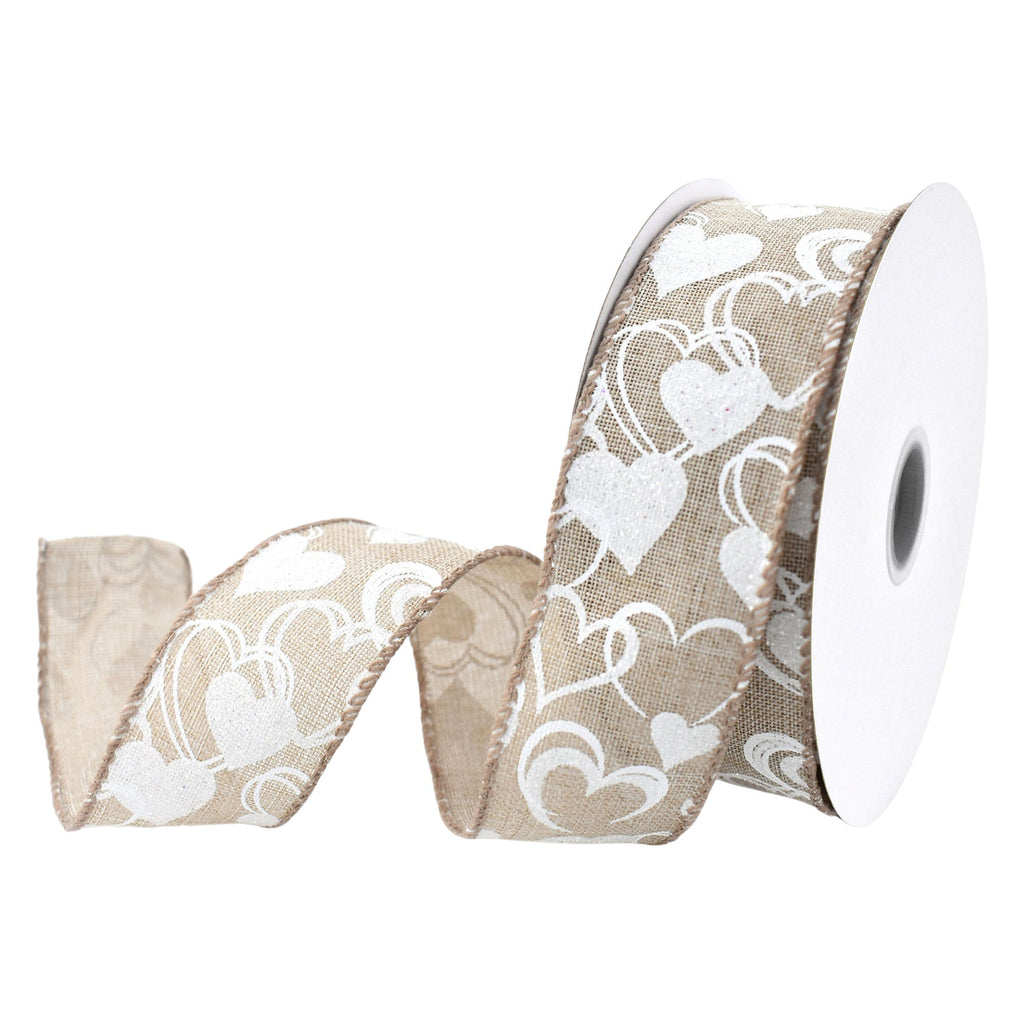 Valentine's Glittered Hearts Faux Linen Wired Ribbon, 1-1/2-inch, 10-yard