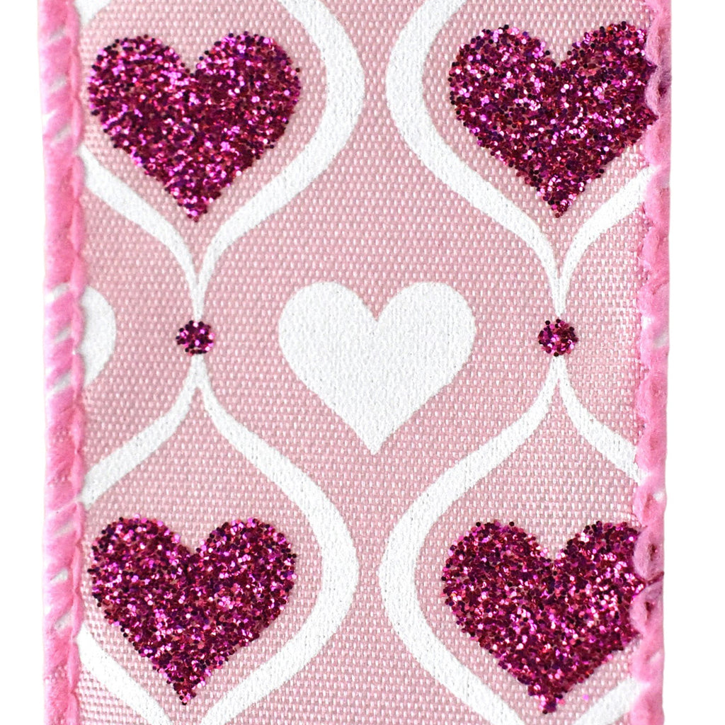 Make your Valentine's Day extra special with this beautiful ribbon complete with glitter for a sparkling touch. Sporting a beautiful pattern of hearts and a classy hourglass shape, this ribbon is elegant and versatile for your crafts. This ribbon can be used as part of a DIY project or as a unique gift wrap to personalize any gift to your loved ones! Note: Contains wire Length: 10 yd Width: 1.5"