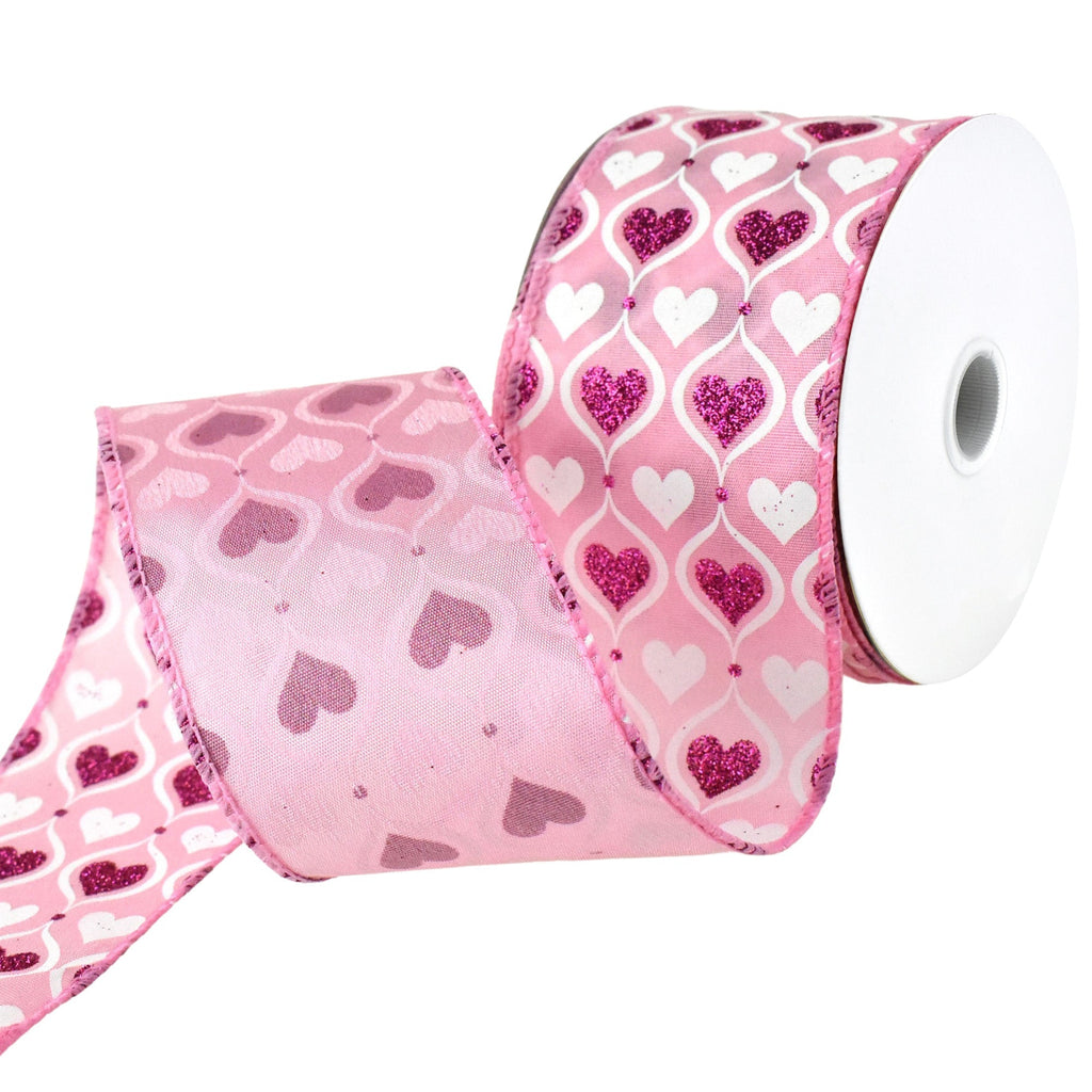 Make your Valentine's Day extra special with this beautiful ribbon complete with glitter for a sparkling touch. Sporting a beautiful pattern of hearts and a classy hourglass shape, this ribbon is elegant and versatile for your crafts. This ribbon can be used as part of a DIY project or as a unique gift wrap to personalize any gift to your loved ones! Note: Contains wire Length: 10 yd Width: 2.5"