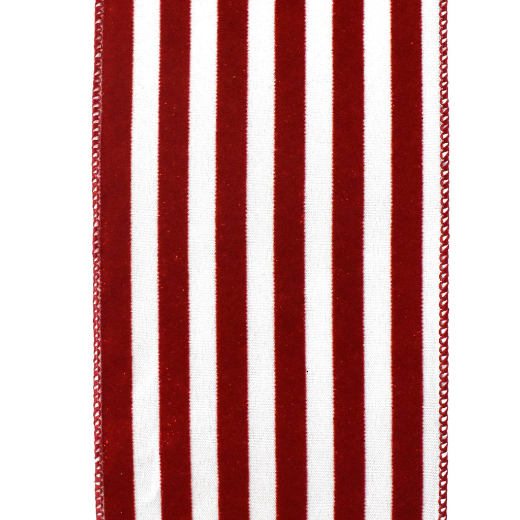 Glitter Flocked Cabana Stripes Wired Ribbon, 4-Inch, 10-Yard - Red/White