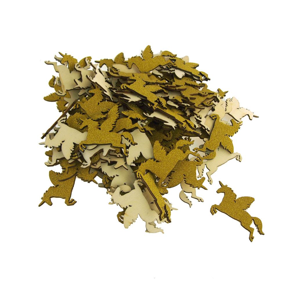 Available in packages of 10, 25, 50, and 100 unicorn glitter wood favors.