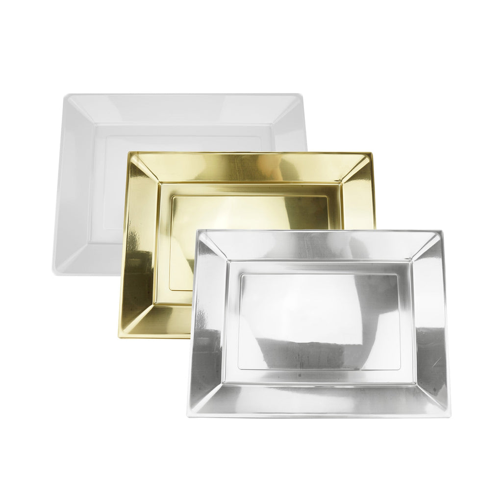 Create an amazing display of snacks and treats with these rectangular party serving trays! These trays are perfect for family get togethers, sports watch parties, and other events. Fill the trays with different varieties of snacks like chips, pretzels, dried fruits and more. Features two plastic trays in a white or metallic gold or silver color. Each pack comes with two identical serving trays. Length: 15" Width: 11"