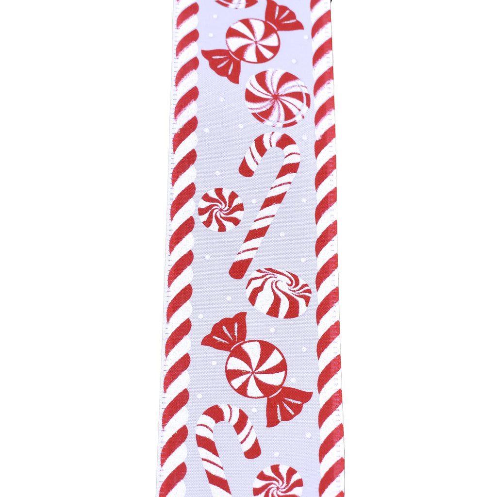 Add your own personal touch to any project! This ribbon features an array of peppermints and candy canes to make the perfect addition to any indoor Christmas home decor, DIY projects, or any other crafting needs. Take your decorating or DIY to the next level! Note: Contains wire Length: 10 yards Width: 2.5"