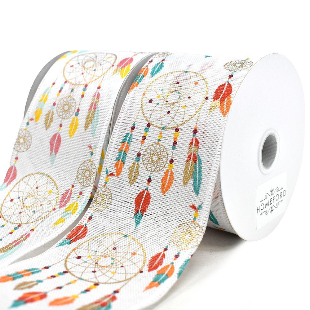 Add your own personal touch to any project! This ribbon features a natural linen fabric with a repeating pattern of dreamcatchers and feathers. Take your decorating or DIY to the next level! Note: Contains wire