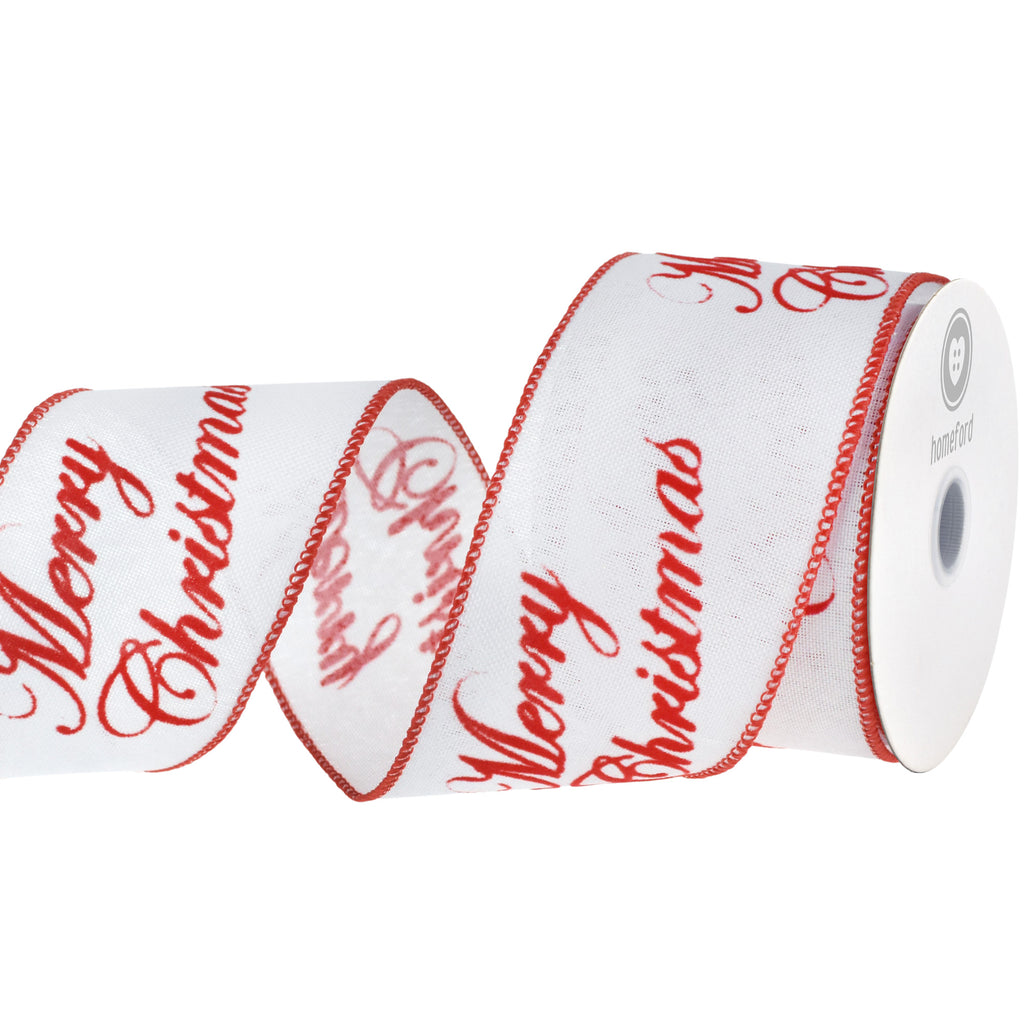 Flocked Merry Christmas Script Faux Linen Wired Ribbon, 2-1/2-inch, 10-yard