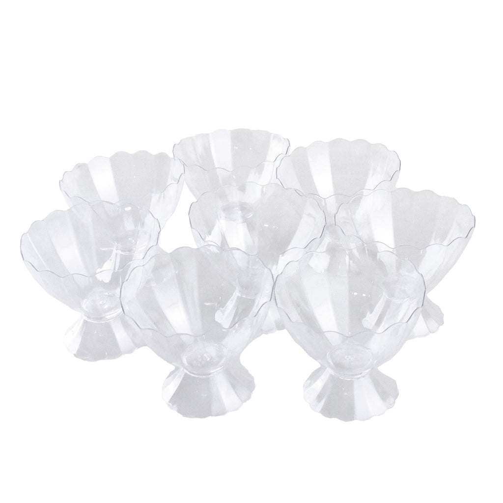Add some flair to your next big party with these elegant dessert bowls! They can hold almost any small treat or pastry. The included stand allow them to be displayed almost anywhere. Length: 3.5" Width: 3" 8pcs