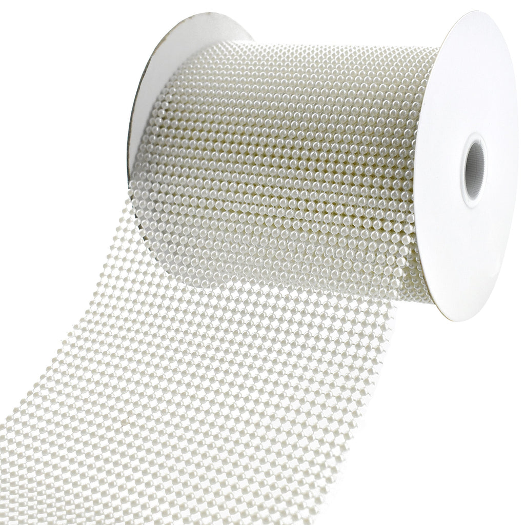 Add your own touch to any project! This ribbon features elegant pearls lined up in 32 rows for the perfect finishing touch to any home decor, DIY, or craft project you use these with. Take your decorating or DIY to the next level! Note: Contains wire Length: 5 yd Width: 4.5"