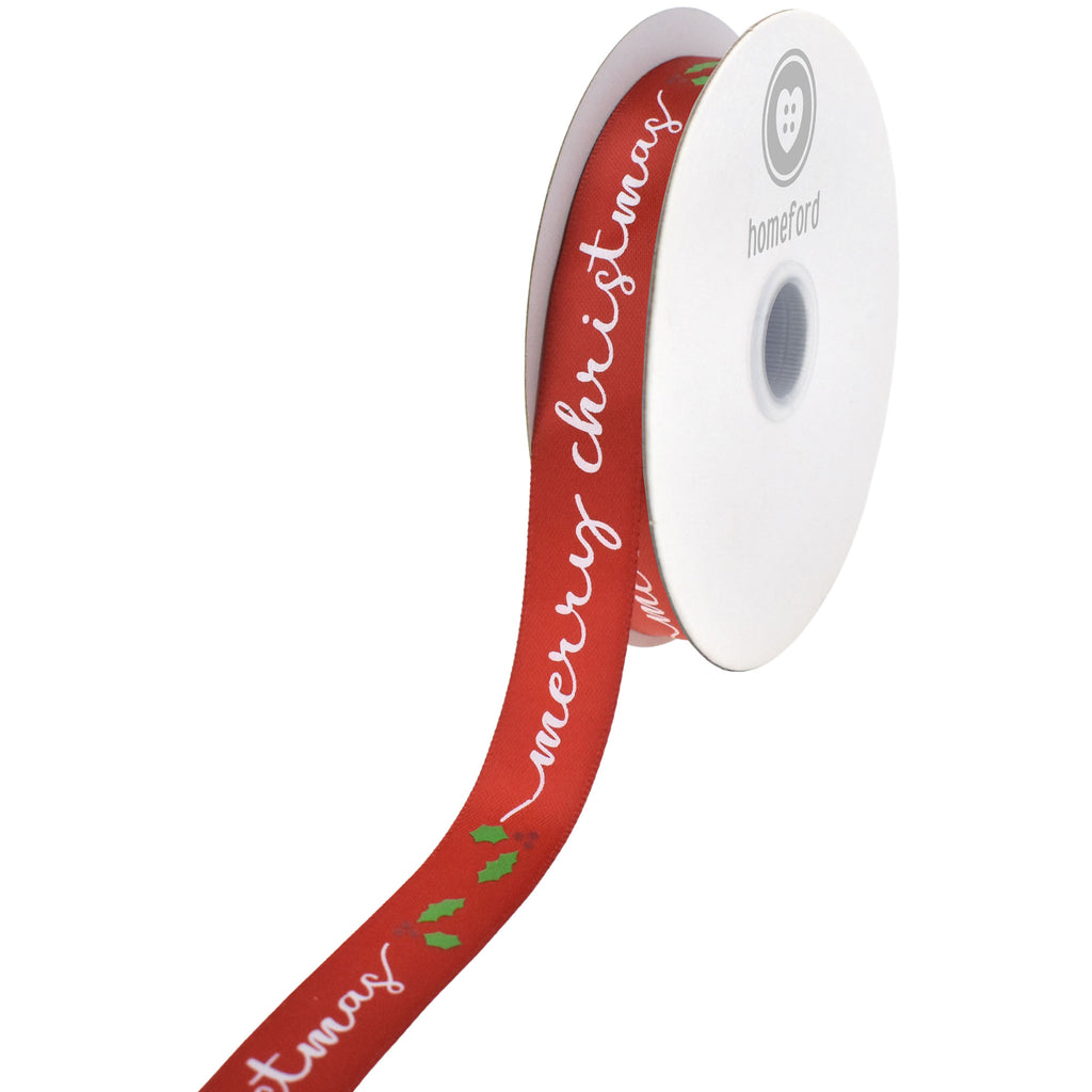 Merry Christmas Cursive Script Holly Berries Satin Ribbon, 5/8-inch, 10-yard