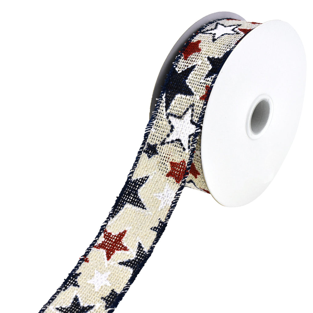 Patriotic Stars Faux Burlap Wired Ribbon, 1-1/2-Inch, 10-Yard