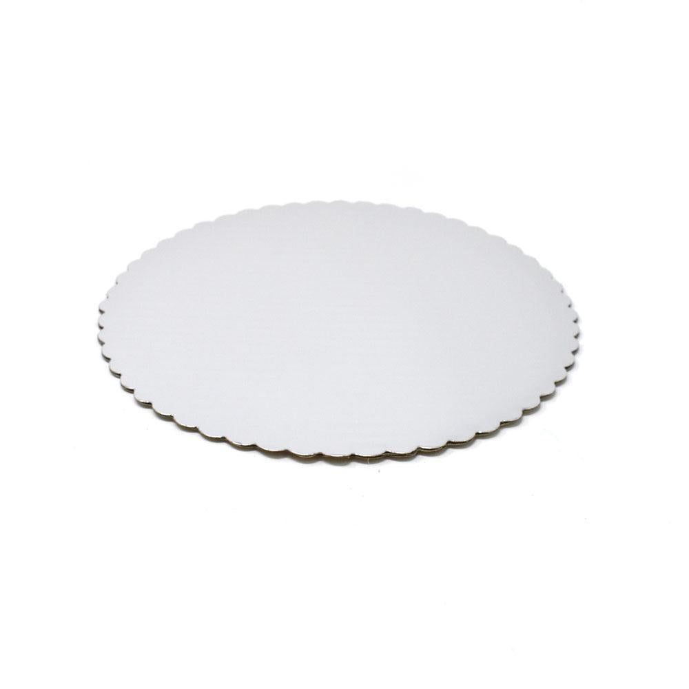 Make any cake look elegant on this gold/silver cake circle. This 10" round cake circle features a cardboard base with a gold/silver finish and a scalloped edge. The finish is on only one side. Perfect to use to display cakes.