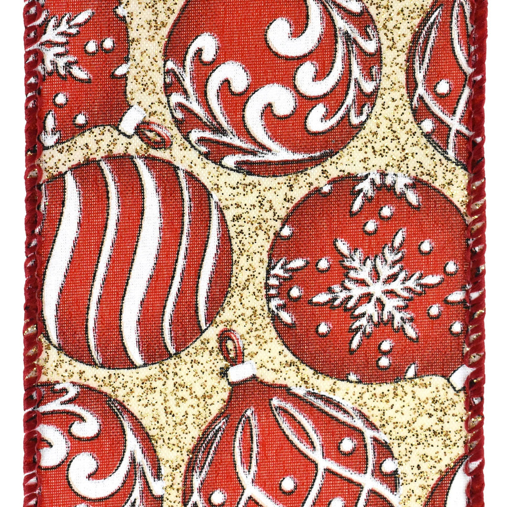Add your own personal touch to any project! This ribbon features a red and white ornament pattern to make the perfect addition to any indoor Christmas home decor, DIY projects, or any other crafting needs. Take your decorating or DIY to the next level! Note: Contains wire Length: 10 yards Width: 2.5"