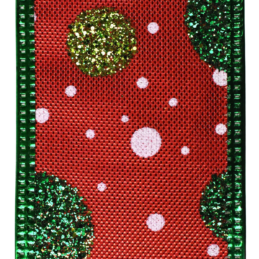 Add your own personal touch to any project! This ribbon features an array of emerald green and lime dots on a snowy red backdrop to make the perfect addition to any indoor Christmas home decor, DIY projects, or any other crafting needs. Take your decorating or DIY to the next level! Note: Contains wire Length: 10 yards Width: 1.5"