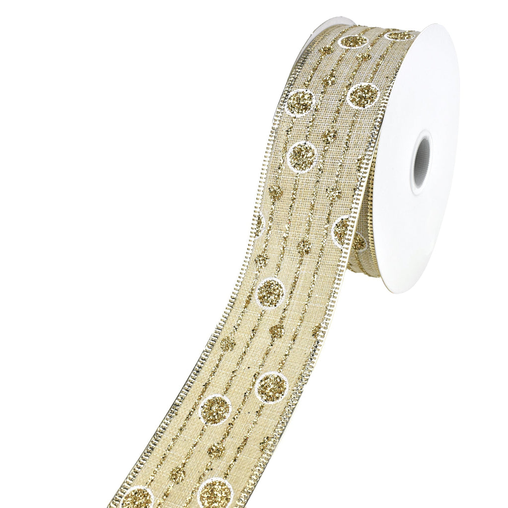 These glitter dots and stripes ribbons are perfect for the winter season. Their beautiful designs are excellent as decorations for gift wrapping and parties or events. These ribbons are also great for arts and crafts, home decor projects and other DIY projects. Features glitter champagne or gold dots and stripes on a linen ribbon and metallic edge. Made of 100% polyester. Width: 1.5" Length: 10 yards