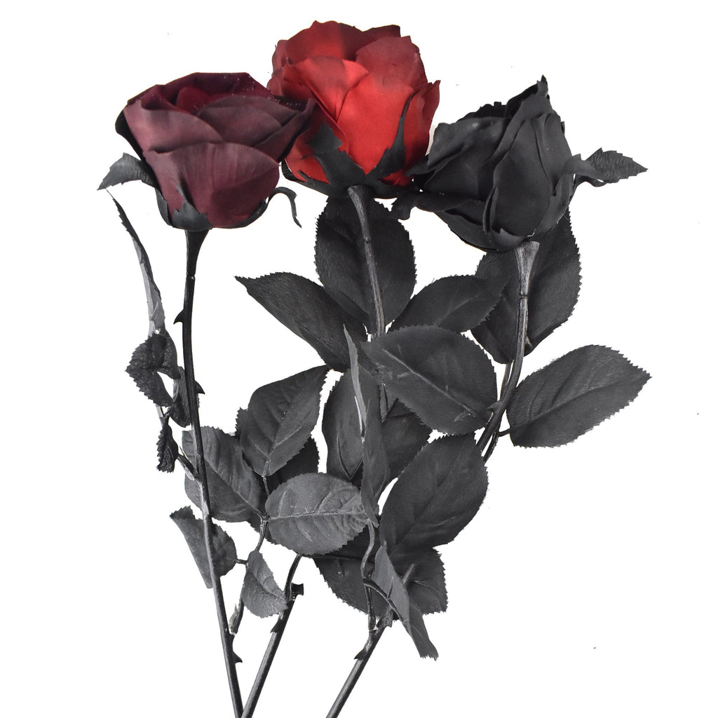 Celebrate the autumn season with halloween long stem roses! These beautiful long stemmed roses are sure to be a great addition to your halloween and Dia De Los Muertos decorations. The roses have a glitter upon the petals and have black petals on each stem. Each order comes with one red, one burgundy and one black rose. Measurements are the same for each rose. Length: 25" Width: 4