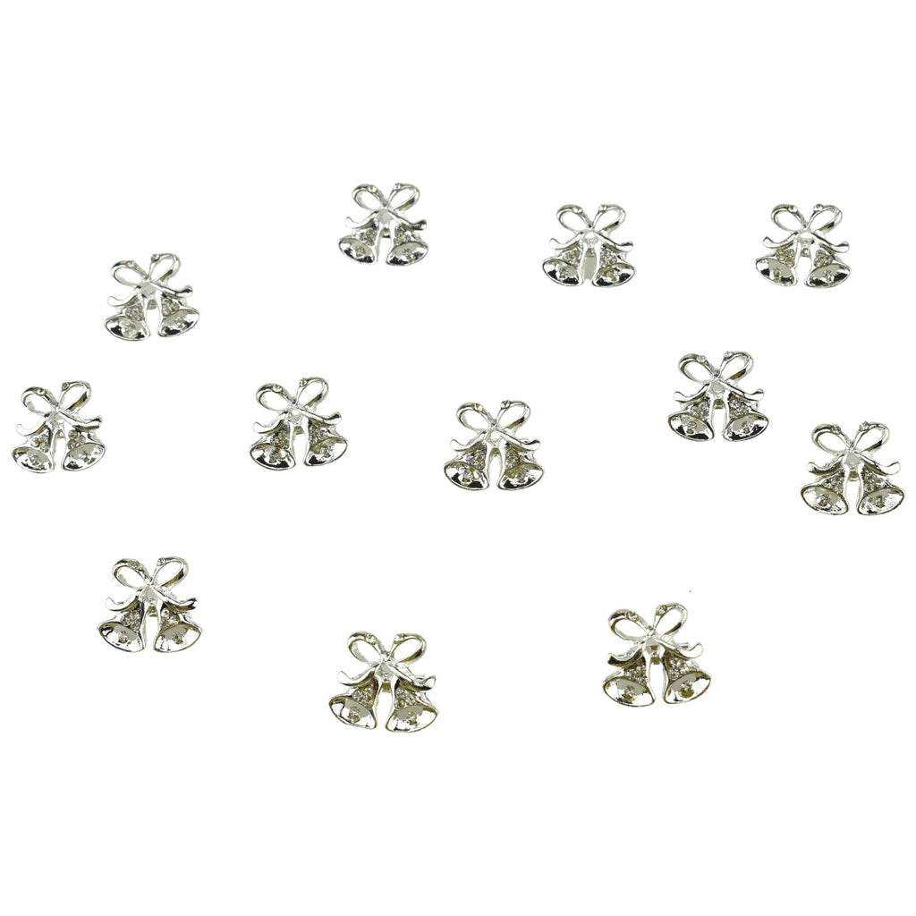 Add a mini accent to your favorite DIY projects with these adorable metal pins. These metal accents feature a twin bells with a bow finished with rhinestones that's ideal for use on jewelry and paper crafts. Perfect for DIY projects like jewelry making, scrapbooking, clothing design, home decorating and more! Pack: 12 pcs Length: 0.875" Width: 0.875"