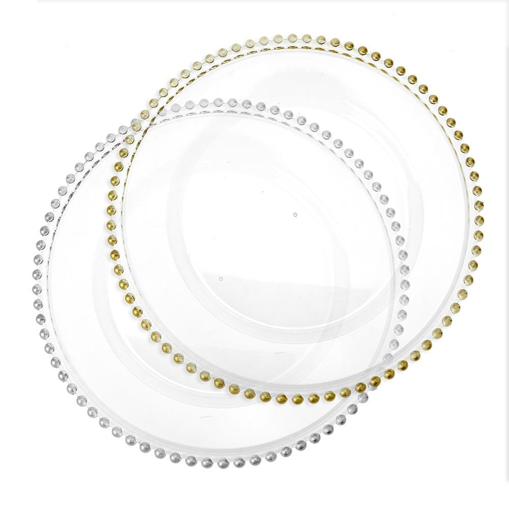 These plates are great for weddings, birthdays, Thanksgiving and other holidays. Features a painted beaded edge on a crystal clear plate.