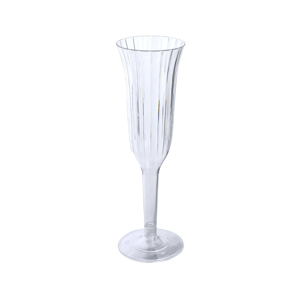 Whether you're celebrating New Year's Eve or weddings, these elegant plastic champagne glasses will make an impression on your guests. Whether it's champagne, cocktails, or sparkling wine you've got to celebrate with these plastic champagne glasses! Add some class to your next party with these champagne glasses, please drink responsibly. Length: 8.5" Width: 2.25" 12 Pcs