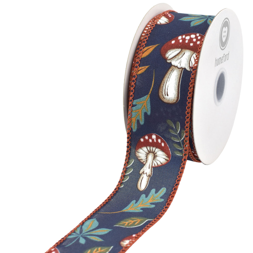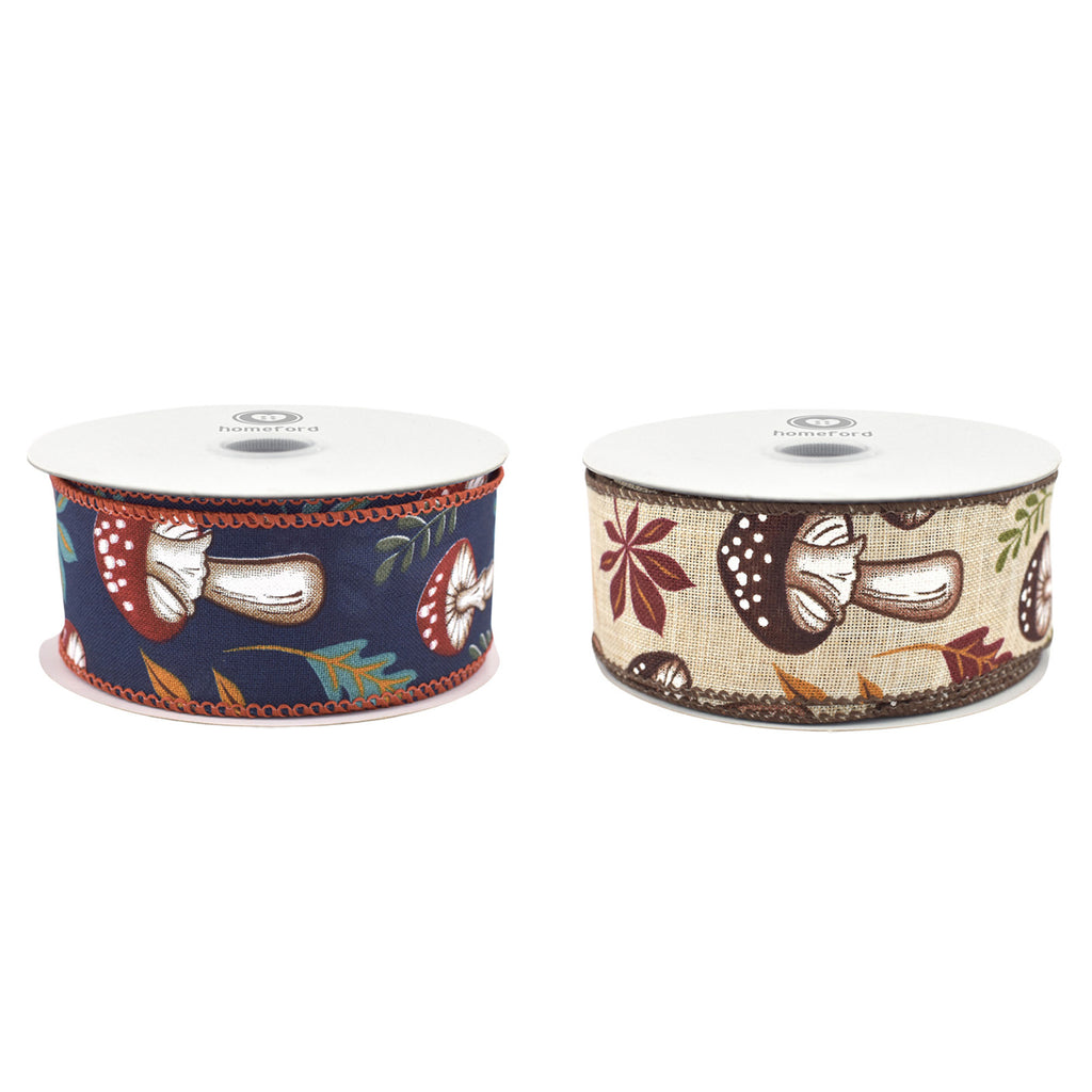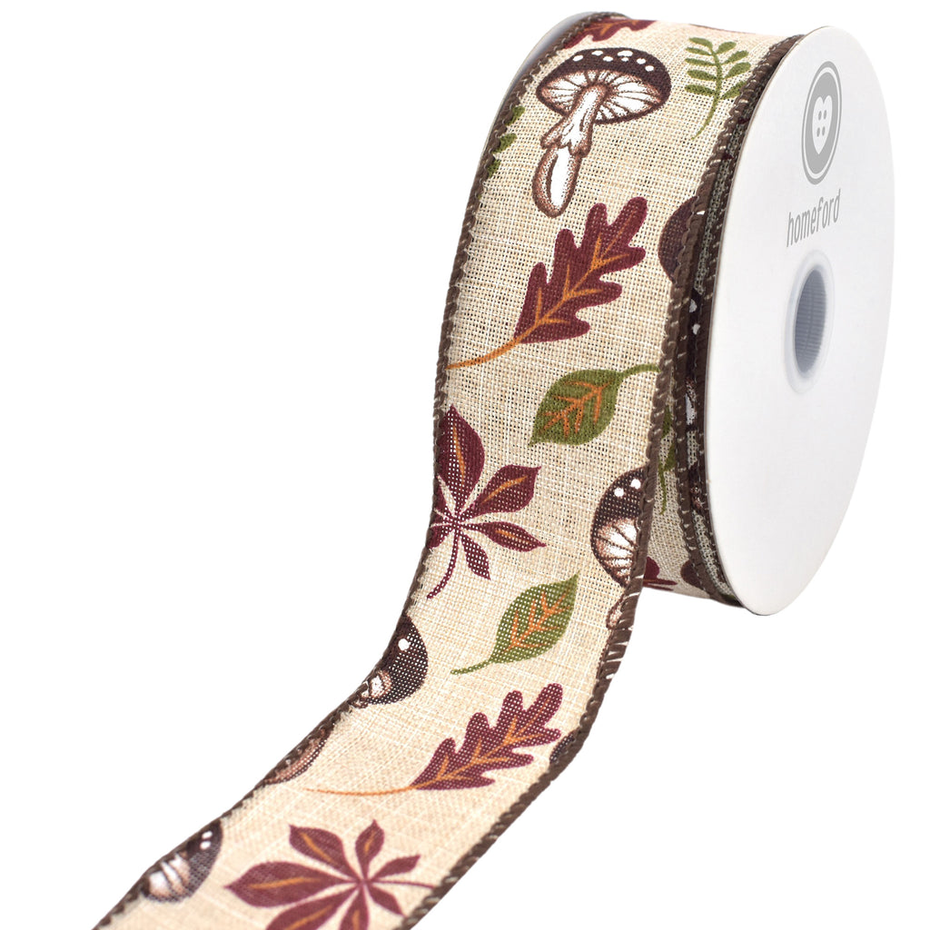 Fall Leaves Mushrooms Faux Linen Wired Ribbon, 1-1/2-inch, 10-yard