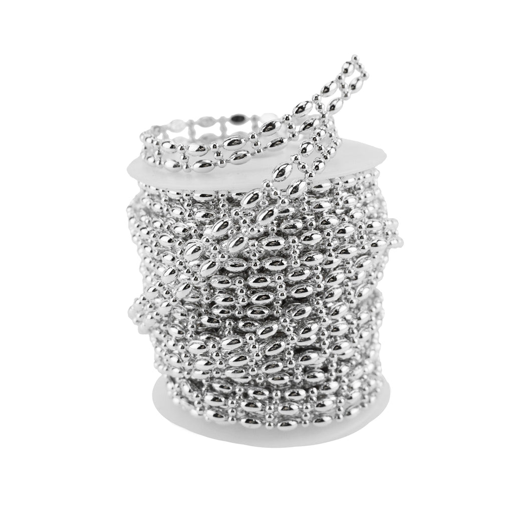 These double lined oval flat pearl trim ribbons are perfect for every season. Their beautiful design is excellent as decorations for gift wrapping and parties or events. These ribbons are also great for arts and crafts, home decor projects and other DIY projects. Features two parallel oval beaded strands attached together by lines of smaller round beads. Comes in the colors: gold, silver, white, and ivory. Please note this is not a wired ribbon. Width: 6mm Length: 12 yards
