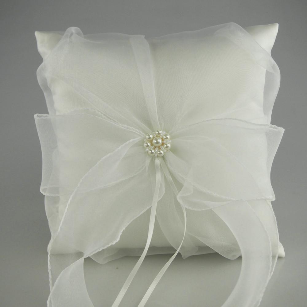 A fancy white pillow, fluffy, and soft to the touch. This pillow can be used as a ring bearer pillow for weddings, bridal showers, anniversaries and the like.