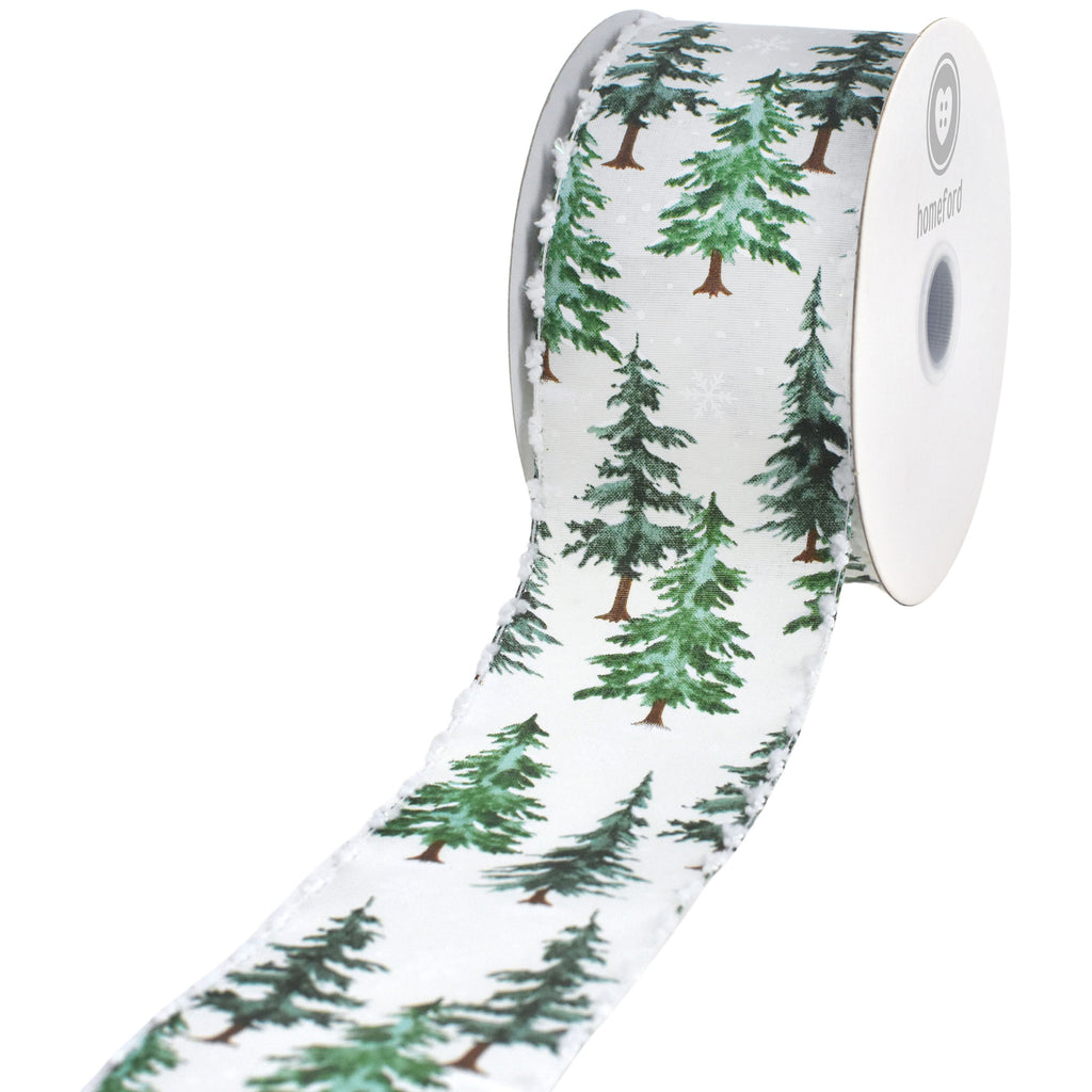 Christmas Pine Trees Snowball Edge Satin Wired Ribbon, 2-1/2-inch, 10-yard