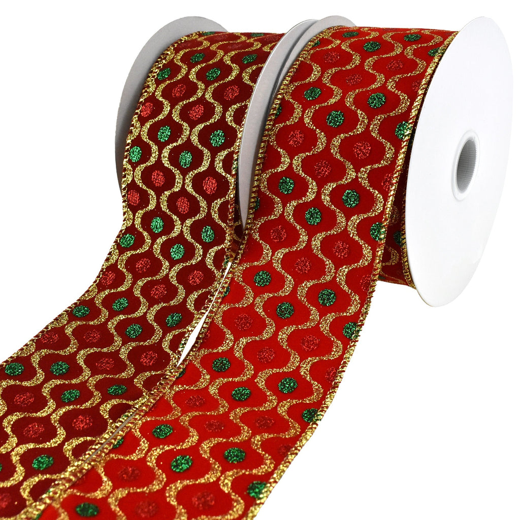 Add your own personal touch to any project! This ribbon features a fun pattern of glittered wavy stripes and dots in festive holiday colors for the perfect addition to any indoor Christmas home decor, DIY projects, or any other crafting needs. Take your decorating or DIY to the next level! Note: Contains wire Length: 10 yards Width: 2.5"