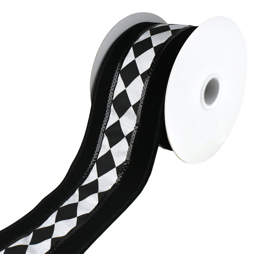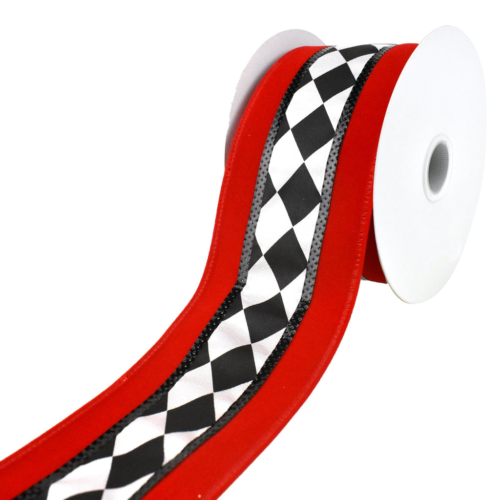 These harlequiin center velvet edge ribbons are perfect for the winter season. Their beautiful designs are excellent as decorations for gift wrapping and parties or events. These ribbons are also great for arts and crafts, home decor projects and other DIY projects. Features a black and white harlequin center and a red or black velvet edge. Made of 65% polyester, 35% acrylic. Width: 2.5" Length: 10 yards