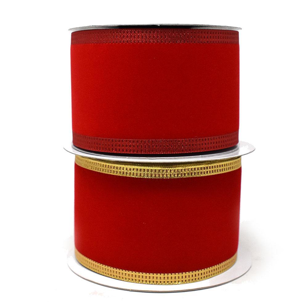 Add your own personal touch to any project! This ribbon features a velvet, red fabric finished with a metallic-sheen trim in very regal fashion. Take your decorating or DIY to the next level!